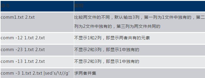 comm命令比較兩個文件的相同和不同,下面為常用的命令舉例: