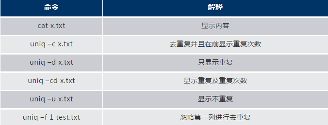 對相同的行去重復,統(tǒng)計重復,保留重復等,還可指定某一列做為去重復關(guān)鍵字去重復,以下為最常用的幾個命令實例