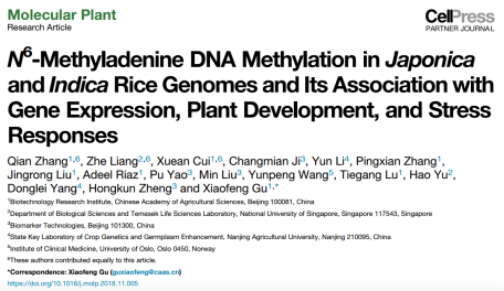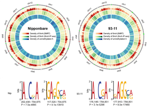 PacBio對(duì)粳稻Nip與秈稻93-11基因組更新:利用PacBio對(duì)Nip和93-11進(jìn)行測(cè)序及Illumina平臺(tái)進(jìn)行g(shù)ap填充和誤差校正后,Nip基因組大小為380.7 Mb(contig N50=16.97 Mb),93-11基因組大小為396 Mb(contig N50=9.64 Mb);進(jìn)一步通過SMRT(單分子實(shí)時(shí)測(cè)序系統(tǒng)Single MoleculeReal Time)測(cè)序數(shù)據(jù),在Nip和93-11中分別檢測(cè)出704875個(gè)和784912個(gè)6mA位點(diǎn)。