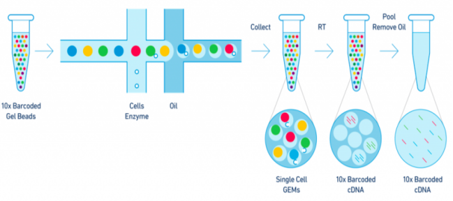 單細(xì)胞測(cè)序,簡(jiǎn)而言之,就是獲取單個(gè)細(xì)胞遺傳信息的測(cè)序技術(shù),其中10 X Genomics單細(xì)胞轉(zhuǎn)錄組測(cè)序平臺(tái)具有廣泛的應(yīng)用。該技術(shù)利用微流控、油滴包裹和barcode標(biāo)記等技術(shù)來實(shí)現(xiàn)高通量的細(xì)胞捕獲技術(shù),能夠一次性分離、并標(biāo)記500–10000個(gè)單細(xì)胞,從而獲得每個(gè)細(xì)胞的3’端的轉(zhuǎn)錄組信息。主要用于細(xì)胞分型和標(biāo)記因子的鑒定,從而實(shí)現(xiàn)對(duì)細(xì)胞群體的劃分與細(xì)胞群體間基因表達(dá)差異的檢測(cè),此外該技術(shù)還可以預(yù)測(cè)細(xì)胞分化與研究發(fā)育軌跡,在當(dāng)下疾病、免疫、腫瘤領(lǐng)域以及組織、器官、動(dòng)植物發(fā)育研究中發(fā)揮越來越重要的作用。