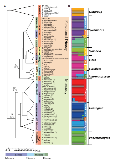 利用112份榕樹材料的基因組重測序數(shù)據(jù),建立了榕樹的系統(tǒng)發(fā)育史,其中包括62種榕樹屬,包括2個雌雄同株亞屬(Pharmacosycea, Urostigma)和4個雌雄異株亞屬(Sycidium,Sycomorus, Synoecia?,Ficus),它們代表了榕樹的6個亞屬和主要分支。白肉榕亞屬(Pharmacosycea)被分至兩類,進化樹、ADMIXTURE、遺傳相關性分析及ABBA-BABA分析發(fā)現(xiàn)了整個屬存在潛在廣泛的種間雜交。系統(tǒng)發(fā)育揭示了雌雄同株代表了整個屬的祖先繁殖系統(tǒng)(圖4)。分化時間顯示,始新世時期(約47.5 Mya)出現(xiàn)了雌雄同株和雌雄異株的分化。