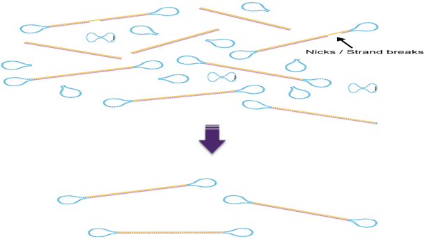 以基因組HiFi文庫為例(15-20K文庫)(圖4)。當(dāng)?shù)玫絞DNA后,先利用G-tube管或Megaruptor System將基因組片段化至合適大小,而后通過去除單鏈懸突、損傷修復(fù)和末端修復(fù)等步驟,得到完整的雙鏈插入片段。接下來,通過將接頭連接至雙鏈DNA來創(chuàng)建SMRTbell文庫,從而得到環(huán)狀模板。完成接頭連接后,需要對連接產(chǎn)物進(jìn)行純化,利用酶處理(圖5)來消化線性或內(nèi)部損傷環(huán)形DNA分子(游離的Hairpin Adapter、兩端未連接Adapter的DNA模板、已成環(huán)但內(nèi)部有損傷的DNA模板),酶處理完畢后,一般會利用Bulepippin或Sage ELF System切膠回收目標(biāo)大小范圍內(nèi)的文庫。