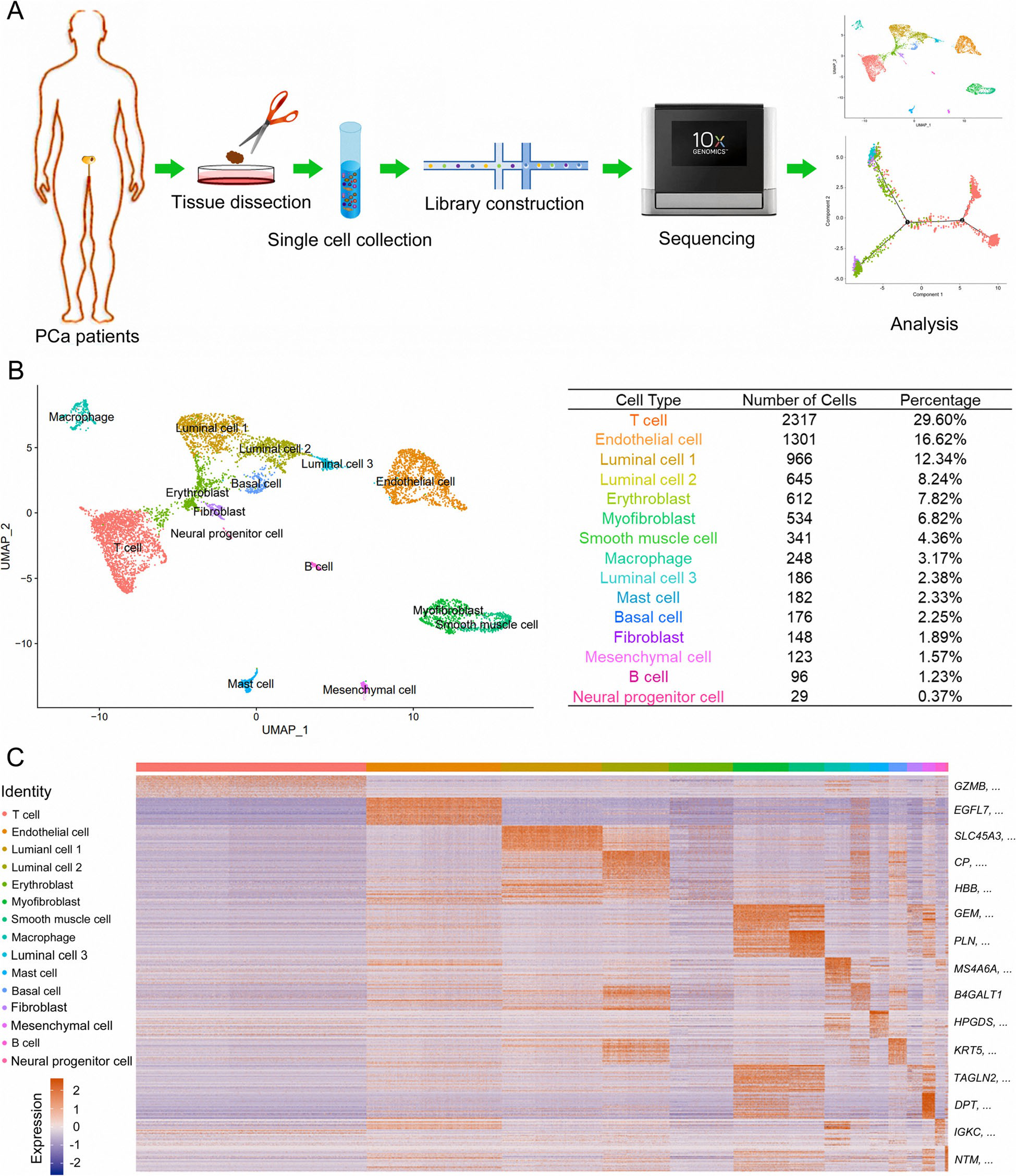 兩名患者通過(guò)前列腺組織中AMACR的過(guò)度表達(dá)和TP63的缺失表達(dá)被診斷為PCa。收集兩名患者的癌樣,解剖并消化成單個(gè)細(xì)胞,用10×基因組學(xué)進(jìn)行scRNA-seq(圖1a)。共有7904個(gè)合格細(xì)胞用于進(jìn)一步分析。通過(guò)PCA對(duì)所有細(xì)胞進(jìn)行無(wú)偏聚類,UMAP可視化細(xì)胞成分(圖1b)。通過(guò)DEG分析確定了15個(gè)主要簇的特征基因:T細(xì)胞、內(nèi)皮細(xì)胞、1型管腔細(xì)胞、2型管腔細(xì)胞、紅細(xì)胞、肌成纖維細(xì)胞、平滑肌細(xì)胞、巨噬細(xì)胞、3型管腔細(xì)胞、肥大細(xì)胞、基底細(xì)胞、成纖維細(xì)胞、間充質(zhì)細(xì)胞、B細(xì)胞和神經(jīng)內(nèi)分泌細(xì)胞(圖1c)。