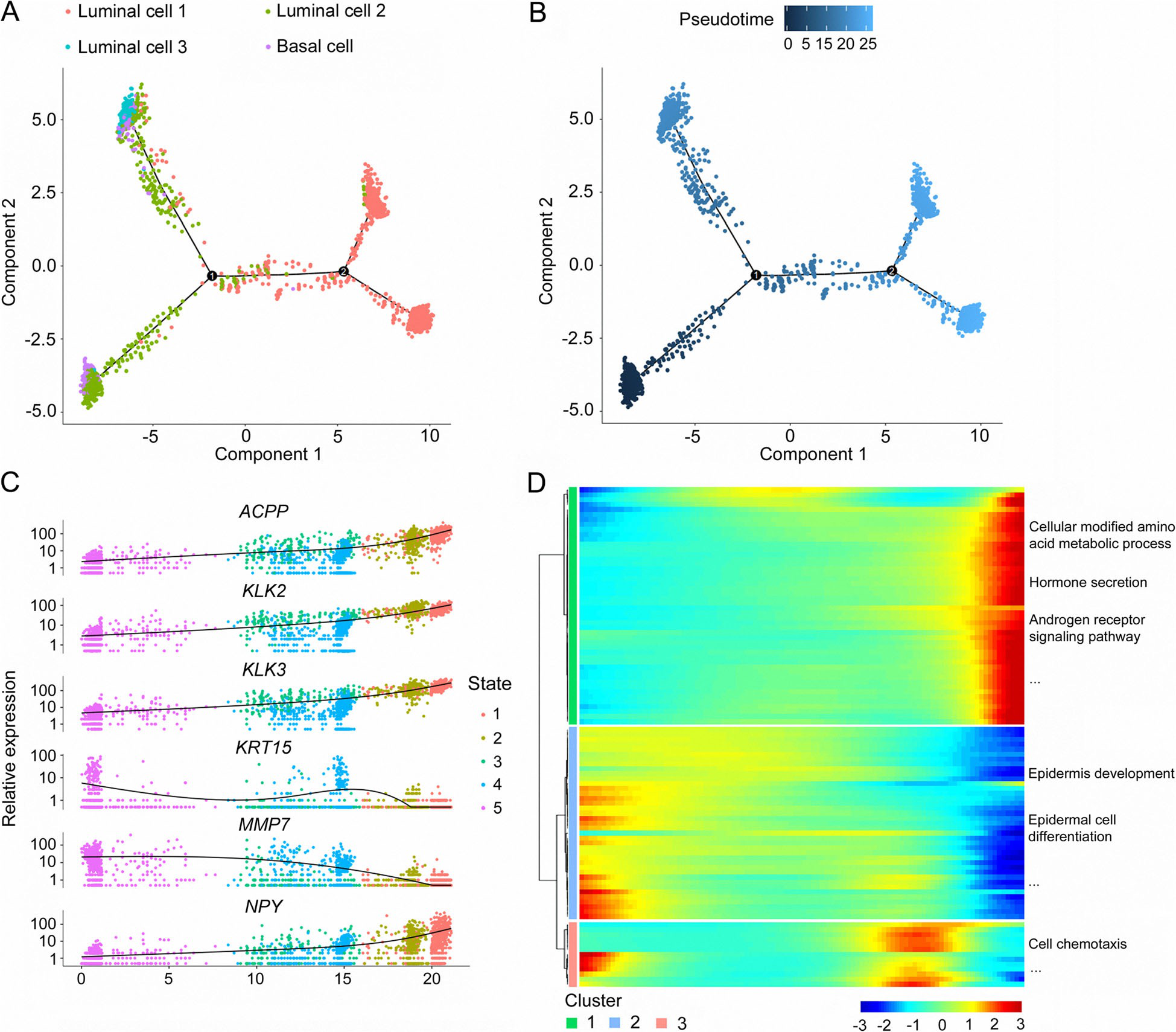 作者進(jìn)一步分析了基因沿軌跡的動(dòng)態(tài)表達(dá)變化,以確定PCa進(jìn)展的關(guān)鍵基因。表達(dá)變化最顯著的基因包括:酸性磷酸酶、前列腺(ACPP)、激肽釋放酶相關(guān)肽酶2(KLK2)、KLK3、角蛋白15(KRT15)、基質(zhì)金屬肽酶7(MMP7)和NPY(圖4c)。此外,作者對(duì)前100個(gè)基因進(jìn)行了擬時(shí)間表達(dá)模式的聚類分析,并分析了每個(gè)簇的功能豐富程度。聚類1中的基因高度表達(dá)于終末期,主要富集于PCa起始和進(jìn)展相關(guān)的過(guò)程,包括細(xì)胞修飾的氨基酸代謝過(guò)程、激素分泌和AR信號(hào)通路(圖4d)。第二類基因在前列腺發(fā)育初期表現(xiàn)出高表達(dá)水平,主要參與表皮發(fā)育和表皮細(xì)胞分化,提示其在前列腺正常發(fā)育中的潛在作用(圖4d)。聚類3中的大多數(shù)基因在假時(shí)間軌跡的中間階段表達(dá)增加,并在細(xì)胞趨化性中富集(圖4d)。