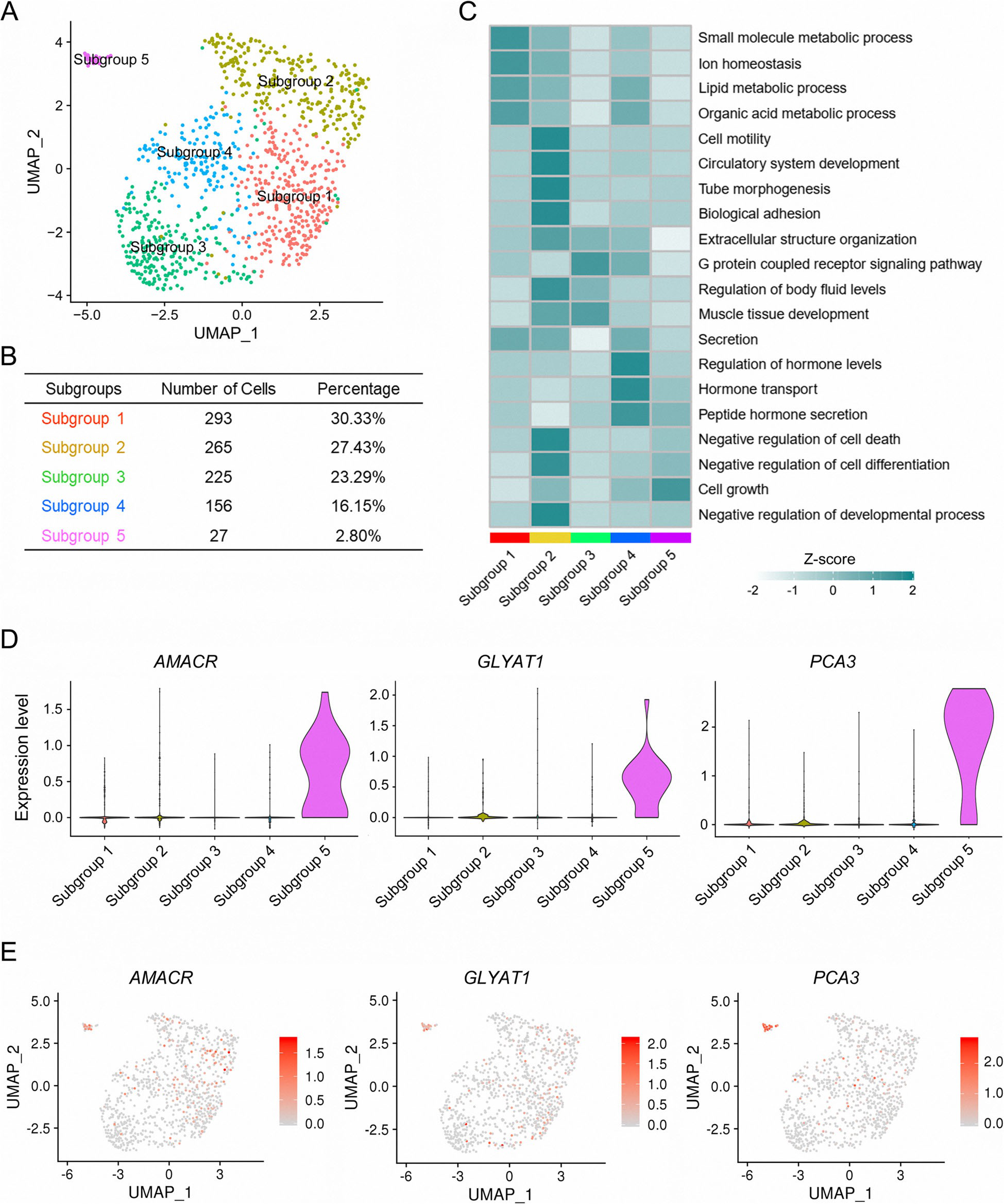 作者首先分析來(lái)自TCGA的公共PCa患者中每個(gè)管腔標(biāo)志基因的表達(dá)水平,以檢驗(yàn)它們與PCa發(fā)生和發(fā)展的臨床相關(guān)性。相比之下,大多數(shù)1型管腔標(biāo)記基因在惡性程度較低的前列腺癌中的表達(dá)高于惡性程度高或正常前列腺,這表明在前列腺癌的發(fā)生和早期發(fā)展中有潛在的作用(補(bǔ)充圖5)。因此,作者對(duì)1型管腔細(xì)胞進(jìn)行了亞聚類,以確定引起PCa的亞群。PCA將1型管腔細(xì)胞分為5個(gè)亞組(圖5a,b)。分析每個(gè)亞組標(biāo)記基因的功能富集,亞組1與腫瘤細(xì)胞有絲分裂準(zhǔn)備所必需的生物分子代謝過(guò)程有關(guān),如脂質(zhì)代謝過(guò)程和有機(jī)酸代謝過(guò)程(圖5c)。與其他亞組相比,亞組2與細(xì)胞運(yùn)動(dòng)、管形態(tài)發(fā)生和細(xì)胞死亡負(fù)調(diào)控有關(guān),這些過(guò)程對(duì)腫瘤的遷移和生長(zhǎng)至關(guān)重要(圖5c)。亞組3主要參與G蛋白偶聯(lián)受體信號(hào)通路和肌肉組織發(fā)育(圖5c)。第4亞組與PCa相關(guān)的過(guò)程,包括激素水平的調(diào)節(jié),激素轉(zhuǎn)運(yùn)和肽激素轉(zhuǎn)錄(圖5c)。相比之下,第5亞群的獨(dú)特功能主要集中在細(xì)胞生長(zhǎng)(圖5c)。VlnPlot和特征圖顯示,AMACR、甘氨酸鈉基轉(zhuǎn)移酶樣1(GLYATL1)和PCA3在5亞組中特異表達(dá)(圖5d,e)。有趣的是,AMACR是一種在前列腺癌中高度表達(dá)的過(guò)氧化物酶體酶,參與支鏈脂肪酸和膽汁酸中間產(chǎn)物的β-氧化,對(duì)PCa的發(fā)生和發(fā)展至關(guān)重要。PCA3是一種非編碼RNA,在PCa細(xì)胞系、原發(fā)組織甚至PCa患者尿液中高表達(dá)。這兩個(gè)5亞組的標(biāo)記物已經(jīng)被用于PCa的診斷和分層,這意味著5亞組可能是臨床上PCa診斷和分層所必需的一組不同的細(xì)胞。