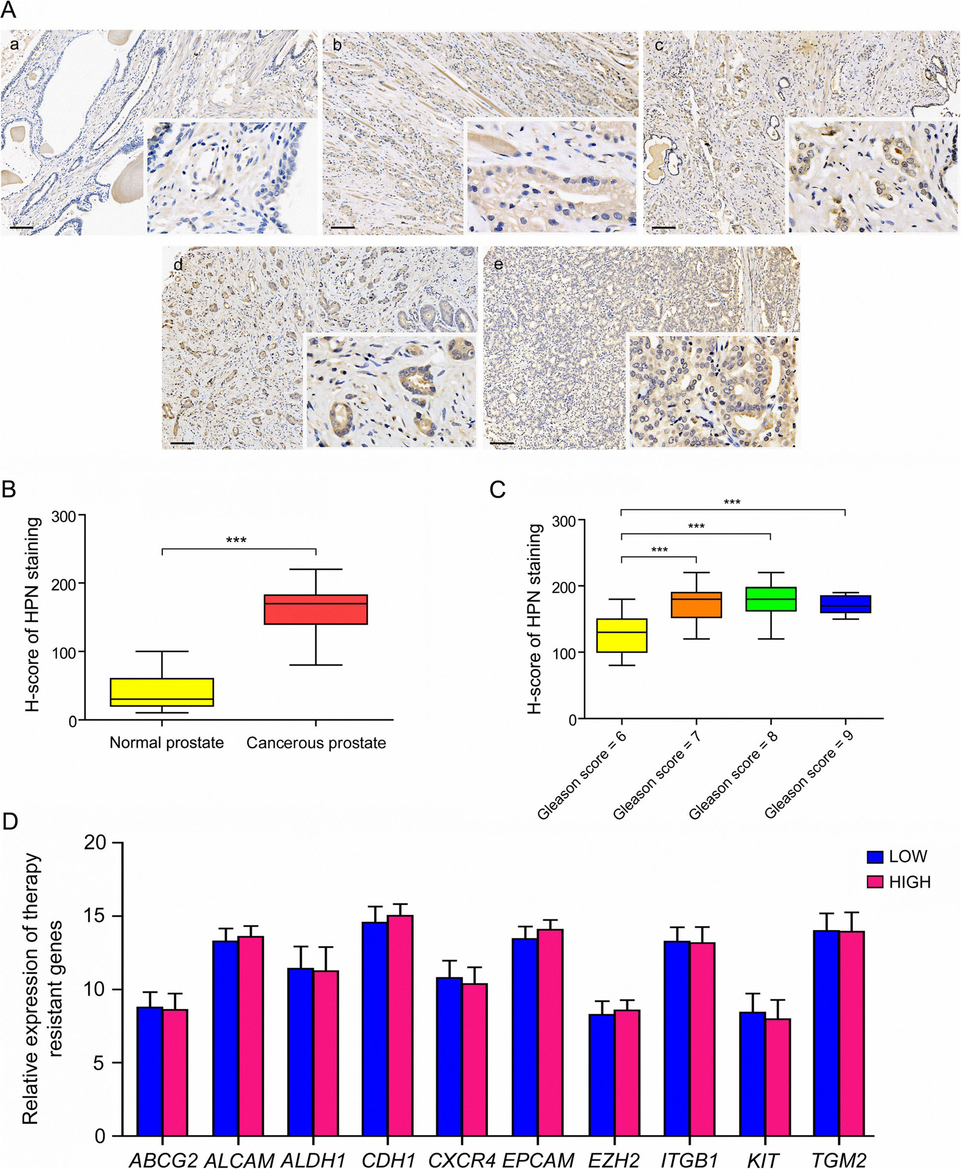 不同病理分級(jí)的癌組織之間(圖7a)。為了檢驗(yàn)強(qiáng)度差異作者進(jìn)一步用Hscore分析免疫染色評(píng)分,發(fā)現(xiàn)HPN在癌組織中的表達(dá)水平顯著增強(qiáng)(圖7b)。此外,高病理分級(jí)(Gleason評(píng)分=7,8,9)的腫瘤組織中HPN的表達(dá)水平顯著高于病理分級(jí)較低(Gleason評(píng)分=6)(圖7c)。因此,作者認(rèn)為HPN可能是臨床PCa診斷和分層更為特異、敏感的生物標(biāo)志物。為了探討HPN在預(yù)測(cè)PCa復(fù)發(fā)中的作用,作者根據(jù)HPN的表達(dá)水平將TCGA患者分為低和高兩組,然后分析了治療依從性標(biāo)記物的表達(dá),包括ATP結(jié)合盒亞家族G成員2(ABCG2)、醛脫氫酶1(ALDH1)、受體酪氨酸激酶(KIT)的表達(dá),活化白細(xì)胞粘附分子。