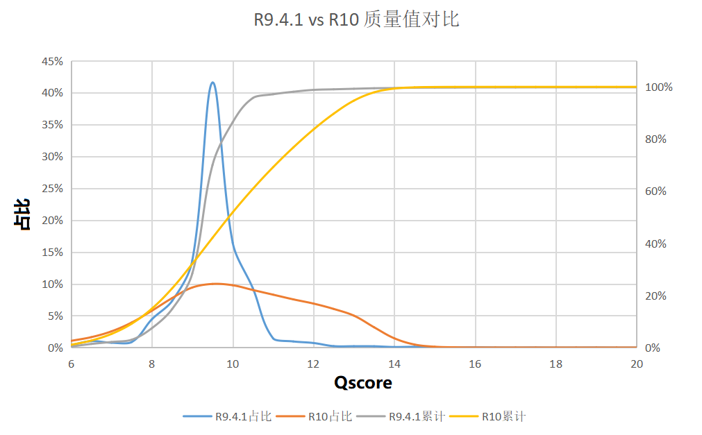 圖1 同一樣本R9.4.1 vs R10 原始產(chǎn)出質(zhì)量值對比