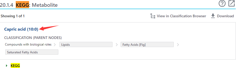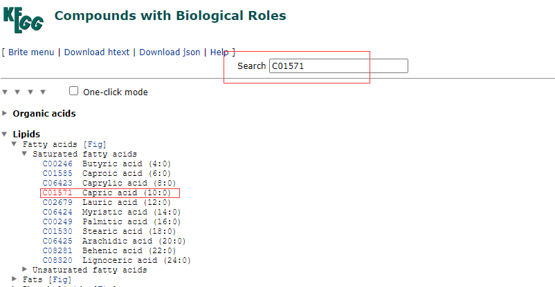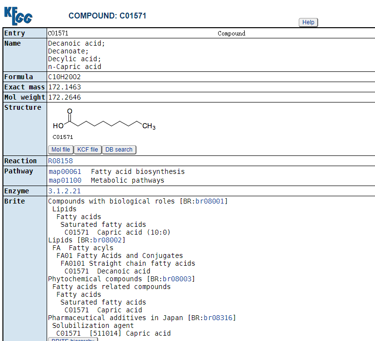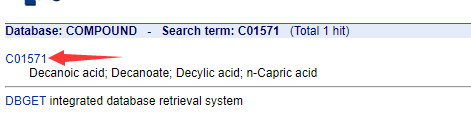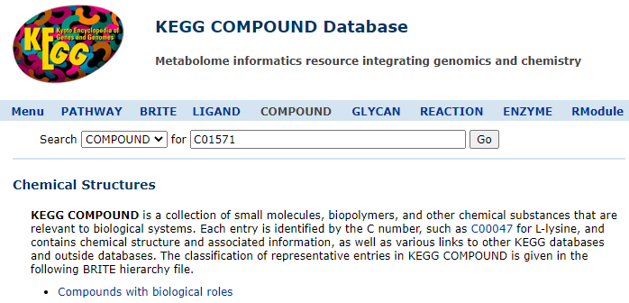 前文提到的KEGG(https://www.genome.jp/kegg/compound/)數(shù)據(jù)庫相信大家都不陌生,它是日本京都大學(xué)和東京大學(xué)聯(lián)合開發(fā)的數(shù)據(jù)庫。它有一個化合物庫,記錄了與通路相關(guān)的化合物,其化合物ID以C開頭,百邁客的分析結(jié)果提供了這個信息。這里我們將上述得到的C01571進(jìn)行檢索: