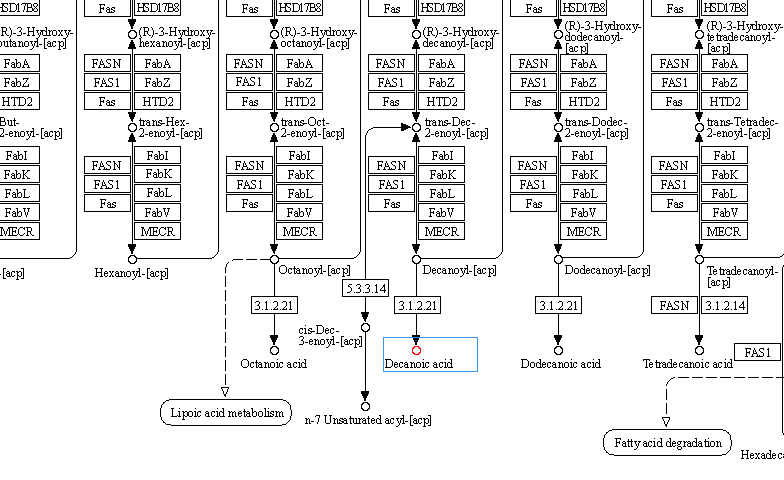 點擊結(jié)果(上圖箭頭)就可以看到具體代謝物的信息,表格中展示了名稱、分子式、結(jié)構(gòu)、化學(xué)反應(yīng)、通路、酶等多種信息,查看通路信息可知道其參與了脂肪酸合成,點擊通路map00061可跳轉(zhuǎn)查看其在通路圖中的具體位置。
