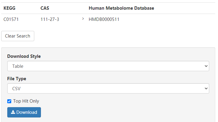 通過前面的檢索頁面我們會發(fā)現(xiàn)相同的代謝物在不同數(shù)據(jù)庫的ID不一樣,不要慌,小編給大家推薦一個好用的ID轉(zhuǎn)換網(wǎng)站:http://cts.fiehnlab.ucdavis.edu/batch。這個網(wǎng)站支持多種數(shù)據(jù)庫,而且可以批量哦!。以C01571(類型為KEGG)為例,查詢其CAS和HMDB信息,見下圖: