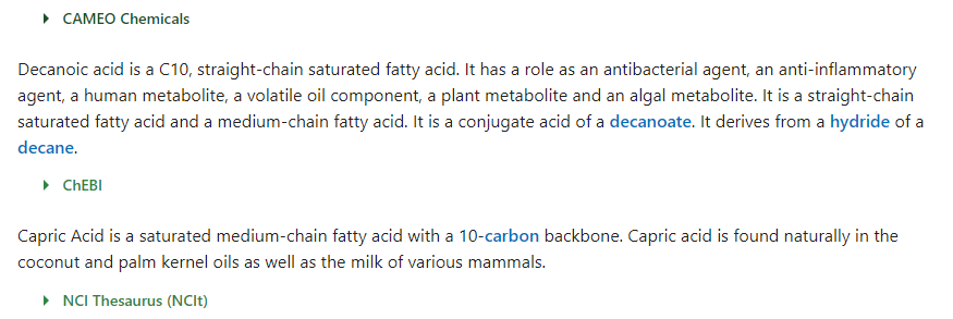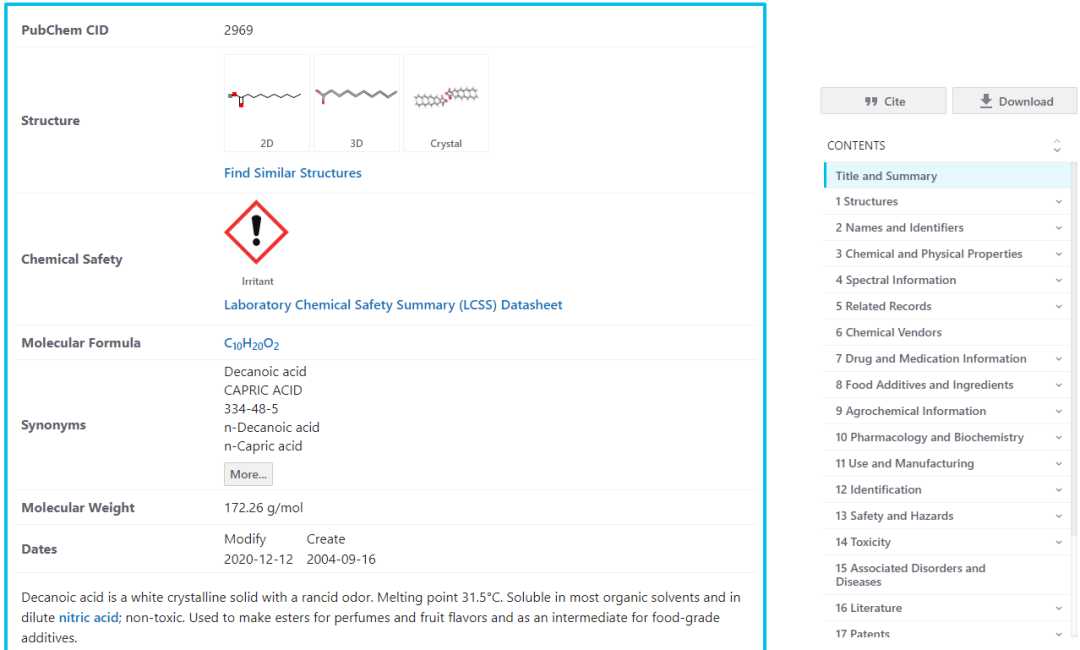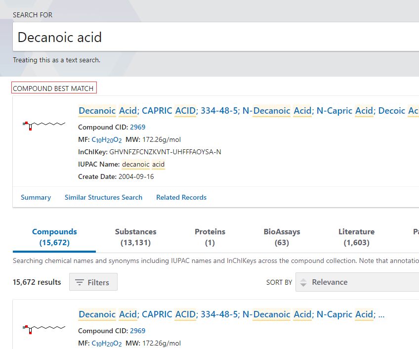 Pubchem(https://pubchem.ncbi.nlm.nih.gov/),它是NCBI下的一個大型的、綜合性的化合物數(shù)據(jù)庫,目前收錄了1億多種化合物信息,支持名稱、縮寫、化學(xué)式、系統(tǒng)命名等多種方式檢索,其結(jié)果包含了化合物的各種命名、相關(guān)聯(lián)的數(shù)據(jù)庫信息、結(jié)構(gòu)、分類、理化性質(zhì)、文獻(xiàn)、質(zhì)譜圖等多種信息。其中頁面開頭的摘要部分可快速了解到該物質(zhì)的特性、生物功能等信息,根據(jù)提供的文獻(xiàn)信息可幫助我們了解目前的研究情況。今天小編以“癸酸”為例教大家如何快速了解一個陌生的代謝組化合物。首先我們在主頁搜索欄中輸入癸酸英文名Decanoic acid,點擊搜索后會得到多個結(jié)果,置頂?shù)囊话銥樽罴哑ヅ?,這里是完全一致的,可以確認(rèn)就是這個結(jié)果。