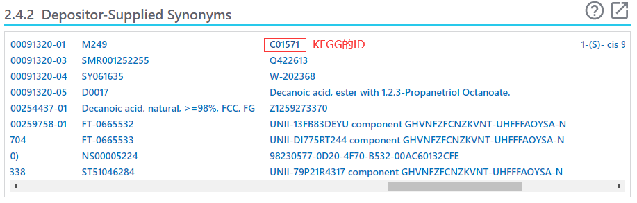 接下來,我們可能想找到這個化合物對應(yīng)的KEGG注釋信息,這里介紹兩種快速簡單的方法:一種是點擊右側(cè)導(dǎo)航欄的Names and Identifiers(一般是第二項),在跳轉(zhuǎn)地方找到Depositor-Supplied Synonyms(可使用Ctrl+F輸入關(guān)鍵詞搜索)同義詞列表,了解KEGG數(shù)據(jù)庫的熟手可以一眼找到對應(yīng)的KEGG ID為C01571。