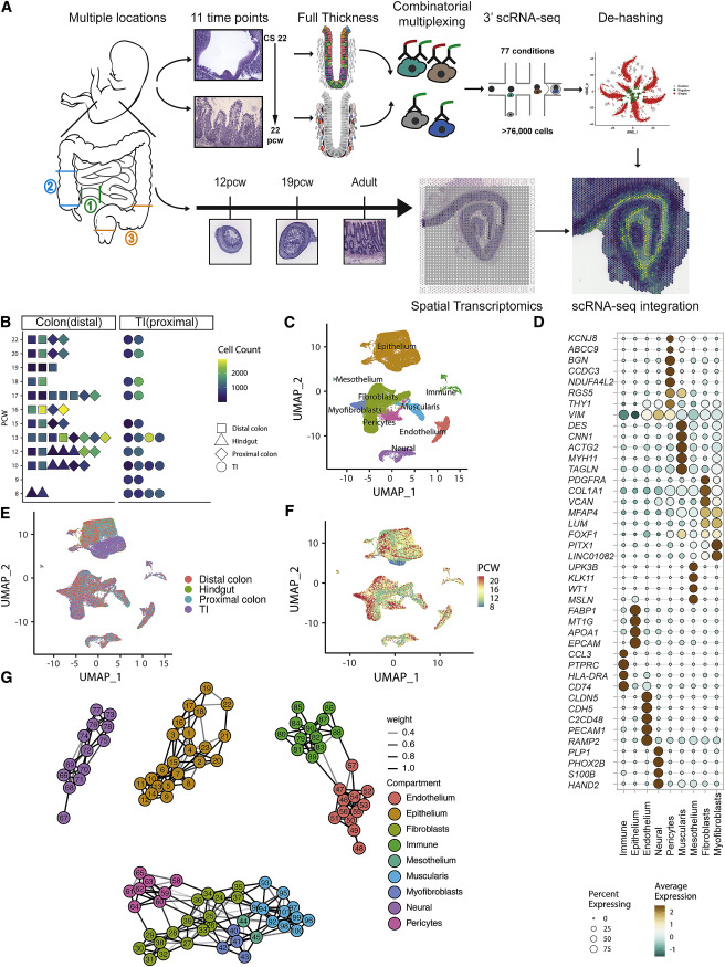 腸道是人體*大的屏障器官,可與腸道菌群共生,協(xié)調營養(yǎng)需求和免疫。多種相互關聯(lián)的細胞類型構成了成熟的腸道及其獨特的形態(tài),但是它們形成的分子基礎仍然不清楚。原腸形成后,后內胚層發(fā)生廣泛折疊產生胚胎腸管,形成小腸和大腸。在早期腸內,假復層的上皮和間充質細胞迅速增殖,導致腸管伸長和變寬。在胚胎發(fā)育的CS14階段左右,快速生長的腸形成環(huán)狀,隨后(CS16)突入胚胎外腔,在受孕后11周(PCW)時返回腹腔。在8-12 PCW之間,假復層上皮彎曲,產生由多種分化的上皮細胞類型組成的絨毛和隱窩結構,并建立由上皮干細胞(ISC)維持的自我更新回路。盡管已經很明確這個過程需要隔室之間協(xié)調發(fā)展,但在人體中其驅動的確切分子機制還是未知的。在小鼠的研究中,PDGFRA表達的位于間質小腸“小丘”下的間充質細胞被認為可促進絨毛的形成,而雛雞模型表明發(fā)育中的肌層的屈曲力會引發(fā)這些事件。組織學分析揭示腸道發(fā)育具有物種特異性差異,強調了直接研究人體組織的必要性。腸道是出生時免疫細胞啟動的部位,腸道免疫細胞的個體發(fā)育缺陷與疾病相關連。先天性或產后早期腸道疾病的發(fā)病機理難以確定,當獲得組織的機會很少時子宮內會發(fā)生異常。單細胞RNA測序(scRNA-seq)分辨率有助于繪制器官發(fā)育圖譜,并揭示了成年腸道中以前未鑒定的細胞類型和與疾病相關的表型。空間轉錄組學(ST)可以將轉錄標記映射到對發(fā)育至關重要的不同區(qū)域,其模式和位置特定的形態(tài)發(fā)生梯度會影響器官發(fā)生。在這項研究中,研究人員利用高通量的scRNA-seq和ST創(chuàng)建了人類腸道發(fā)育的大規(guī)模單細胞時空圖譜,繪制了跨時間,位置和細胞區(qū)室的形態(tài)發(fā)生圖;編譯了一個集成的在線資源,對細胞多樣性,細胞間信號傳導和轉錄調控網絡進行了分類,以突出祖細胞的起源和位置的命運決定。