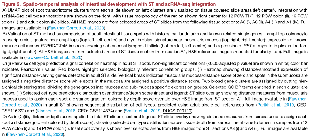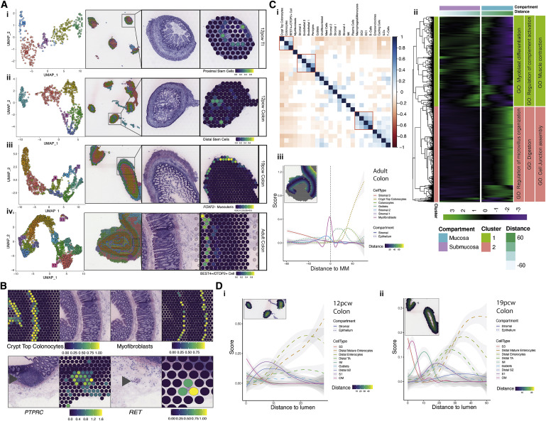 研究人員鑒定了2,893個與深度相關的基因(<5%FDR),反映了不同層次的活躍途徑(Figure Cii) -肌肉/神經過程(收縮/軸突形成)向吸收管腔功能(微絨毛組織和消化系統(tǒng)過程)發(fā)展的深度富集點,與細胞類型特征的順序富集相符(Figure?2Ciii)。在胎兒ST顯著的差異包括外肌層和內肌層在19個PCW時占據離散的空間層,而不是12個PCW時(Figure 2D)。