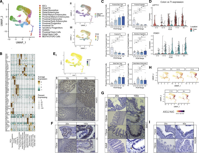 研究人員觀察到近端和遠端ISCs隨著時間的推移逐漸增加。這與ISC轉錄程序的早期位置差異形成對比,例如遠端LEFTY1和近端FOXD1及其下游調控網絡基因(Figure3C,3D和S3B)。這些差異由關鍵的位置信號轉通路支撐,例如,結腸LEFTY1通過激活素A受體(ACVR2B)參與了假定的神經相互作FigureS3?C1)。在早期發(fā)育中(<12 PCW),研究人員發(fā)現(xiàn)了近端上皮干樣祖細胞群,該細胞群發(fā)展為早期腸上皮細胞。這些細胞表現(xiàn)出許多原始功能,包括在中胚層分化重要的VTN基因高表達,與ISCs相比,LGR5表達較少,和ONECUT2表達參與上皮發(fā)育(Figure 3B和FigureS3?D)。這些細胞在SI中特異表達TF GATA4(Figure3Ei), SI是一種小鼠早期內胚層調節(jié)因子,在12 PCW后,其表達大部分丟失這些細胞高表達轉鐵蛋白(TF)( Figure3B和3F),證實了鐵代謝在絨毛形成中的重要性。LGR5是一種典型的ISC基因,在妊娠早期(<12 PCW)的近端/遠端廣泛檢測到低水平ISCs和干樣祖細胞(Figure3B和FigureS3D)。原位雜交(ISH)證實了在10PCW處彌漫的LGR5表達,后來定位于隱窩堿基(Figure3G),類似于在雞和小鼠發(fā)育中報道的Lgr5的行為。即使在隱窩形態(tài)建立之后(如19 PCW之后),ISC仍分別構成遠端/近端樣本中捕獲的上皮細胞的18%–22%(Figure3C),高于成人結腸的scRNA-seq研究捕獲的3%-4%。與此相符,研究人員發(fā)現(xiàn)ASCL2?TF模塊(包括下游目標LGR5)隨著發(fā)育時間的增加而顯著增加(Figure3H)。