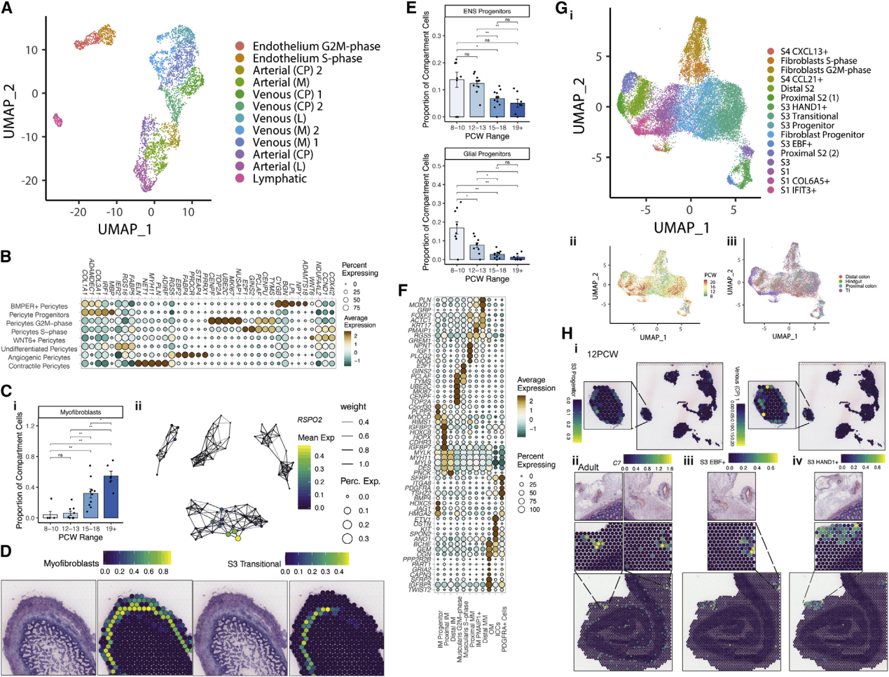 轉錄標簽通常對應于結構特征。在EC中可以清楚地看到這一點,將EC分為靜脈,動脈和淋巴管類型,并通過血管大小進一步區(qū)分(Figure4?A;TableS1)。在發(fā)育過程中,觀察到了從小血管到大血管的過渡,反映了腸道血管生成(Figure S4?A)。確定了驅動這種變化的TF網絡,例如動靜脈分化器HEY1SOX13。成年ST的脈管系統(tǒng)很容易識別成年EC和胎兒EC信號(Figure S4?B)。與EC相對的,周細胞亞型由血管生成驅動因子PRRX1,THBS4ANGPT2)定義(Figure 4?B;table S1)。ANGPT2是EC-周細胞RL相互作用的關鍵調節(jié)因子,已證實其位于胎兒脈管系統(tǒng)中(Figure S4C)。盡管EC隔室與8 PCW處存在的大血管細胞截然不同,但周細胞種群顯示出發(fā)育滯后。為了了解這些分化動力學,研究人員將G2M和S期周細胞與G1期細胞進行了比較,發(fā)現(xiàn)在較早時間點的大多數細胞是高度循環(huán)的祖細胞(Figure S4?D)。這些種群與成纖維細胞和原始的ACTA2?+細胞共享轉錄特征,這一結果受到軌跡分析的支持(Figure S4?E)。綜上所述,提出了早期成纖維細胞向周細胞的轉變,然后是來自未成熟WNT6表達細胞的第二波周細胞增殖-分化。16 PCW時,成熟的成肌纖維細胞表現(xiàn)出相似的發(fā)育滯后(Figure 4?Ci;table S1)。文獻表明腸道成肌纖維細胞可能來自多種來源,并且圖形抽象顯示成熟的成肌纖維細胞類似于肌肉細胞,在特定基因(例如RSPO2,F(xiàn)igure 4?Cii)中存在明顯差異。然而,肌成纖維細胞祖細胞卻表現(xiàn)出來自成纖維細胞和周細胞的梯度譜;在19 PCW的ST中,它們占據了與過渡間質細胞相鄰和重疊的層。(Figure 4?D和S4?E)。