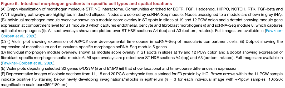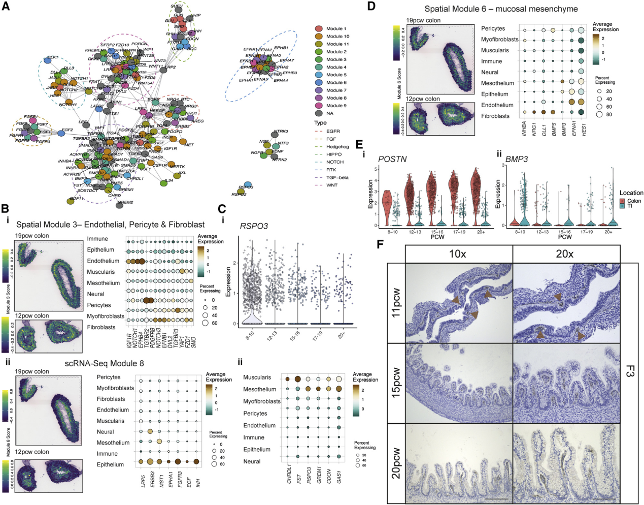 理解腸道發(fā)育的基本問題是局部形態(tài)發(fā)生梯度及其拮抗劑是如何塑造腸絨毛形態(tài)發(fā)生的。研究人員創(chuàng)建了一個涉及8條途徑的基因形態(tài)發(fā)生圖,用以闡明這些分子在空間和時間上的作用。利用共表達分析確定了11種細胞類型特異性和13種空間共定位的形態(tài)發(fā)生模塊,在所有ST中對模塊活性進行了評分(Figure5A和S7?A)。這些模塊通常與ST中的組織深度對齊,空間模塊3由來自EC、成纖維細胞和周細胞起源的形態(tài)發(fā)生子組成,包括LRP1,并且在組織深處(Figure5?Bi)。上皮特異性模塊表達了Hedgehog通路(IHH)的基因,例如在Wnt信號中起重要作用的卷曲的共受體LRP5,并位于管腔附近(Figure5?Bii)。另一個含有肌纖維母細胞成分的細胞,具有形態(tài)發(fā)生原WNT2B和受體RSPO2,在12PCW時出現(xiàn)彌漫性,并在以后逐漸定位(FigureS7?B)。這與發(fā)現(xiàn)成熟的成肌纖維細胞在上皮成分后出現(xiàn)的發(fā)現(xiàn)一致,表明ISC-成纖維細胞信號傳導回路直到隱窩形成后才建立。WNT2B由間皮表達,在成肌纖維細胞分化之前提供了配體的唯一來源(FigureS7B)。類似地,RSPO3,其可以用信號通知經由ISC的LGR5(FigureS7Ci)在間皮/肌層模塊中很高,主要在12 PCW之前見到,然后隨著時間的流逝隨著組織深度的增加而消失(Figure5C)。這表明,隨著腸的生長,原本可能因層間物理距離的增加而被打破的形態(tài)梯度,可以通過依次發(fā)育的細胞類型的表達而恢復。