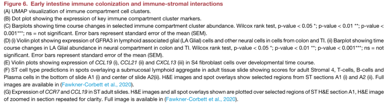 為了在空間上確認這些相互作用,研究人員研究了成人ST,其中粘膜下淋巴濾泡被視為獨特的結構。S4和免疫細胞(例如CD3和CD19)的關鍵標記基因在這些卵泡中和周圍表達,因子分析證實了各種成年免疫細胞(B細胞,T細胞和髓樣細胞)和此處定位的S4細胞類型(Figure6) F)。研究人員還發(fā)現(xiàn)ST中關鍵RL對的顯著共定位(包括CCR7 / CC19(1個點內p = 1.098×10 -10,半徑內p = 5.59×10 -49)(Figure6G)。表明S4細胞是成年結腸中與卵泡相鄰的成纖維細胞,在胎兒GALT發(fā)育過程中以時間依賴性方式出現(xiàn)。