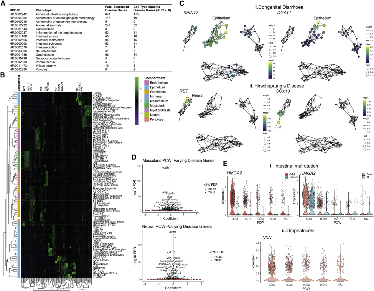 ????先天性腸道疾病的發(fā)病機制仍然是未知的,因為缺乏遺傳缺陷的基礎,而且子宮內早期會發(fā)生一些異常。腸道腹側突出,伸長,旋轉和重新定位都發(fā)生在妊娠的前三個月,并且偏差可能導致諸如食管膨出等發(fā)育異常。為了揭示可能導致先天性腸道疾病的關鍵時間轉錄缺陷,研究人員將數據與人類表型本體論(HPO)中注釋了遺傳表型的圍產期腸道疾病的分類列表相關聯(lián)。通過將749個已知的疾病基因與scRNA-seq數據整合在一起,將先天性疾病與表型聯(lián)系起來,這些表型可能通過高度細胞類型特異性缺陷(Figure7A和Figure7B)表現(xiàn)出來,并導致腸道、腹側、會陰、神經節(jié)、炎癥或腫瘤病理障礙(Figure7 A)。