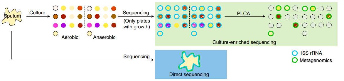 基于作者之前的研究(肺囊性纖維化患者的痰液樣本富集培養(yǎng)擴(kuò)增子測(cè)序鑒定到48科細(xì)菌,其中43科可以培養(yǎng)),收集到的樣本分別在有氧和厭氧條件下,經(jīng)過13種不同的培養(yǎng)基富集。同時(shí),對(duì)這些樣本直接進(jìn)行16S rRNA測(cè)序,富集培養(yǎng)后的共26個(gè)樣本也進(jìn)行16S測(cè)序,同時(shí)挑選了8個(gè)富集后的樣本進(jìn)行宏基因組測(cè)序。