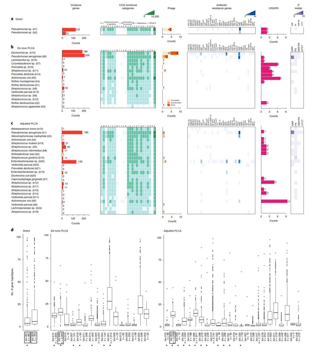 通過富集培養(yǎng)獲得的分類學(xué)多樣性的增加直接轉(zhuǎn)化為該微生物群落功能信息的增加(圖6)。富集培養(yǎng)測(cè)序在直系同源蛋白簇(COGs)、毒力基因、抗生素抗性基因、CRISPRs和次級(jí)代謝功能方面獲得更大的多樣性和功能鑒定數(shù)量。先前的研究已經(jīng)證實(shí)囊性纖維化氣道以及整個(gè)人類微生物群中存在單一物種的異質(zhì)性群體。作者通過鑒定基因單倍型來計(jì)算每個(gè)宏基因組bin的遺傳變異性(圖6d)。在一些宏基因組bins中,作者鑒定到一個(gè)一致的和少量的基因單倍型,表示這個(gè)bin代表一個(gè)單一的基因組群體(即一個(gè)菌株)。在大多數(shù)bins中,作者觀察到大量的單倍型多樣性,指示異質(zhì)性群體,即多菌株。不出所料,這些區(qū)域中每個(gè)基因的單倍型數(shù)量是多種多樣的,這表明細(xì)菌基因組內(nèi)進(jìn)化壓力的已知范圍。平均而言,假單胞菌屬種中鑒定出更多的基因單倍型,富集培養(yǎng)的bins比直接測(cè)序更多。然而,直接測(cè)序鑒定了大量的普遍存在的單倍型基因離群值。Bin的完整性與平均單倍型頻率沒有相關(guān)性。