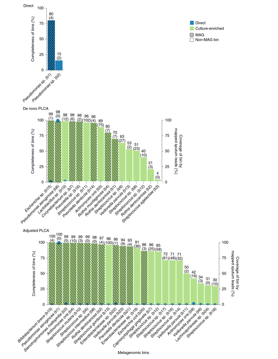 作者將擴(kuò)增子測(cè)序與富集培養(yǎng)宏基因組測(cè)序相結(jié)合研究人類微生物群落。以肺囊性纖維化為例,平均培養(yǎng)了82.13%的可操作分類單元(OTUs),占痰液樣本直接測(cè)序所鑒定的相對(duì)豐度的99.3%,更重要的是,與直接測(cè)序相比,富集培養(yǎng)方法鑒定的OTUs多了63.3%。作者開發(fā)了平板覆蓋算法(PLCA),以確定富集培養(yǎng)平板的代表性子集,從而在該子集上進(jìn)行宏基因組研究。與不依賴培養(yǎng)的方法相比,可以恢復(fù)更多的物種多樣性(包含更好的低豐度物種的組裝基因組,MAGs),更長(zhǎng)的重疊群和更好的功能注釋結(jié)果。PLCA算法也可以應(yīng)用于此前發(fā)布的腸道菌群數(shù)據(jù)集,富集培養(yǎng)分子圖譜可以更好的了解微生物菌群在人類健康和疾病中的作用。