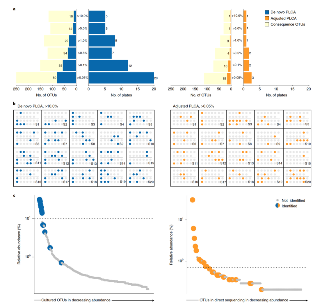作者采用了PLCA算法,來決定需要進(jìn)行富集培養(yǎng)宏基因組測(cè)序的最小樣品數(shù),算法對(duì)任何含有大部分可培養(yǎng)富集的菌群生態(tài)均適用。PLCA算法有兩個(gè)版本,從頭 PLCA不依賴于直接測(cè)序結(jié)果再現(xiàn)富集培養(yǎng)菌群,而校正PLCA側(cè)重于直接測(cè)序結(jié)果中OTU的修復(fù),這取決于是否都對(duì)原始樣品的菌群組成感興趣。采用這兩種算法,數(shù)據(jù)集凸顯了不同樣本的獨(dú)特性:從頭PLCA顯示,每個(gè)樣本具有獨(dú)特的平板集,并且每個(gè)培養(yǎng)條件對(duì)每個(gè)樣本都是必要的;校正PLCA顯示對(duì)數(shù)據(jù)集中樣本進(jìn)行富集培養(yǎng)宏基因組測(cè)序是很有必要的(圖4a,b)。
