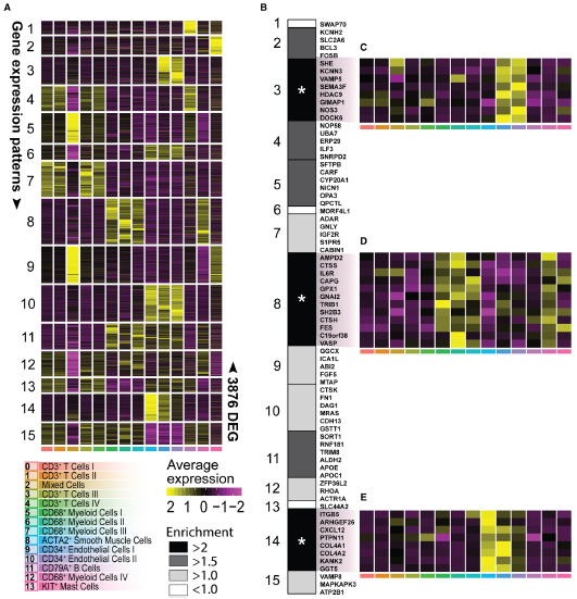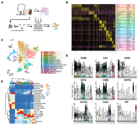 我們觀察到3個非免疫細胞簇(簇8,9和10;表達CD34和ACTA2[肌動蛋白α2,平滑肌])和11個白細胞簇(圖1B和1D)。后者包括5個淋巴細胞簇(第0、1、3、4、11簇;表達CD3E、CD4、CD8、CD79A),5個髓系簇(第5、6、7、12和13簇;表達CD14、CD68、KIT),和1個沒有明確的細胞類型表達譜的混合細胞的簇(第2簇),但與其他簇有相似的基因表達,似乎主要含有凋亡的髓系細胞和T細胞(圖1B和1D)。T細胞是我們數(shù)據集中豐富的群體,占所有分析細胞的52.4%,而髓系群體占所有細胞的18.5%。