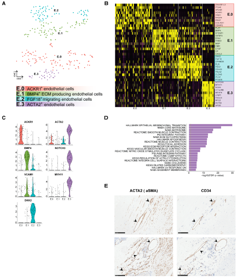 EC簇之間的聚集以及SMC相關通路的富集(圖2D),表明這個亞群可能正在經歷內皮細胞向間充質細胞的轉變,或者反之亦然。為了驗證這些發(fā)現(xiàn),我們觀察了ACTA2和CD34在連續(xù)的組織學切片上的表達(圖2E)。