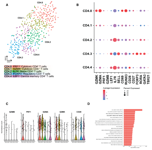 為了更詳細地定義T細胞,我們分離和重新聚類CD4+T細胞,發(fā)現(xiàn)了5個亞類(CD4.0-CD4.4,圖3A),其中主要的區(qū)別是它們的激活狀態(tài),而不是通常用于定義CD4+T輔助亞群的轉錄因子和細胞因子(圖3B和3C)。CD4.0和CD4.1具有細胞毒基因表達譜,此外,這一簇中的基因表達證實了與適應性免疫反應相關的促炎通路的富集(圖3D)。