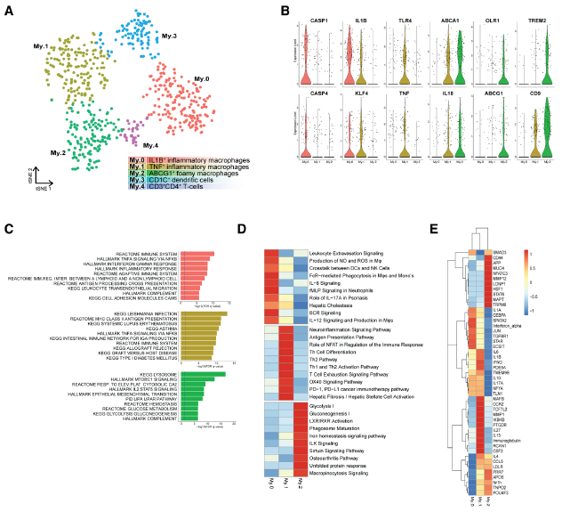 我們分離和重新聚類動脈粥樣硬化性髓系細胞,揭示了5種不同的表型(My.0-My.4,圖4A)。My.0、My.1和My.2很可能代表不同激活狀態(tài)的巨噬細胞。促炎標志物基因(圖4B)以及免疫和炎癥通路的富集結果(圖4C)表明,My.0和My.1亞類由促炎巨噬細胞組成。My.0顯示了最近招募的巨噬細胞的特征(圖4C,D),表明共表達的炎癥體被激活(圖4B)。與My.0和My.1相比,My.2缺乏明顯的促炎標志物,并顯示巨噬細胞和泡沫細胞的跡象。