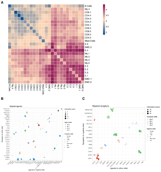 接下來,我們基于CellPhone?DB v2.0檢查了不同細胞類型之間潛在的配體-受體相互作用,以預測病變內的細胞間通訊。淋巴細胞和肥大細胞的潛在相互作用的絕對數(shù)低,而髓系細胞、內皮細胞和平滑肌細胞的相互作用的絕對數(shù)高(圖5A)。