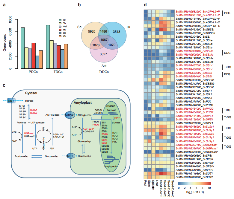 接下來作者研究了黑麥淀粉生物合成相關(guān)基因(SBRGs)中的基因復(fù)制。研究發(fā)現(xiàn)這些重復(fù)類型在黑麥淀粉生物合成相關(guān)基因(SBRGs)中普遍存在,并且不同的SBRG的復(fù)制基因之間往往表現(xiàn)出表達(dá)差異,說明不同類型的基因復(fù)制可以豐富黑麥基因在重要生物過程中的遺傳多樣性(圖4c),這些黑麥SBRGs的新變化可能為調(diào)控植物淀粉生物合成和性質(zhì)提供新的酶活性,因此解析全套黑麥SBRGs有利于提高黑麥的產(chǎn)量潛力和營(yíng)養(yǎng)品質(zhì)。