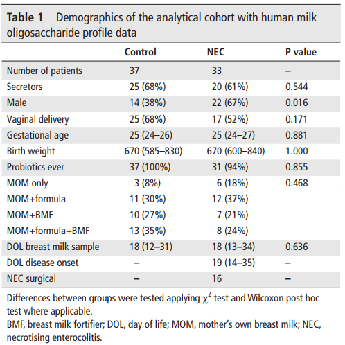 目的:壞死性小腸結(jié)腸炎(NEC)是一種影響早產(chǎn)兒的嚴(yán)重腸道疾病。人們對(duì)其潛在機(jī)制知之甚少:母親自己的母乳(MOM)具有保護(hù)性,可能與母乳寡糖(HMO)和嬰兒腸道微生物相互作用。作者研究了HMO和嬰兒腸道微生物組發(fā)育之間的相互作用及其與NEC之間的關(guān)系。設(shè)計(jì):作者對(duì)33例NEC患兒和37例對(duì)照母乳中的母乳寡糖進(jìn)行了分析。對(duì)48名嬰兒(含14例NEC患兒)糞便進(jìn)行了縱向宏基因組測序(n=644)。