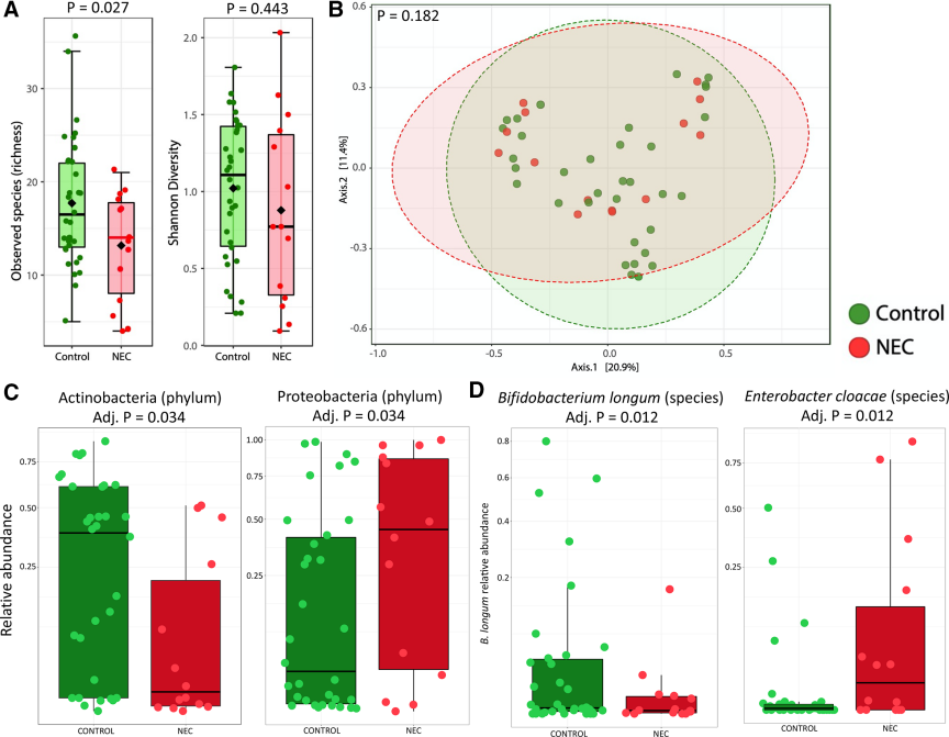 作者納入了含有HMO數(shù)據(jù)的嬰兒的糞便微生物組數(shù)據(jù),進(jìn)行獨(dú)立研究獲得宏基因組測序數(shù)據(jù)。14例NEC患兒和34例對(duì)照組的644個(gè)糞便樣本。NEC患兒物種豐富度顯著降低,shannon指數(shù)差異不顯著(圖3A)。PCoA分析顯示NEC和對(duì)照之間細(xì)菌菌群結(jié)構(gòu)差異不大(圖3B)。門水平分析顯示,相比于對(duì)照組NEC患兒Actinobacteria 相對(duì)豐度顯著降低,Proteobacteria 相對(duì)豐度顯著升高(圖3C)。種水平分析相比于對(duì)照組NEC患兒B. longum相對(duì)豐度降低,Enterobacter cloacae相對(duì)豐度升高(圖3D)。