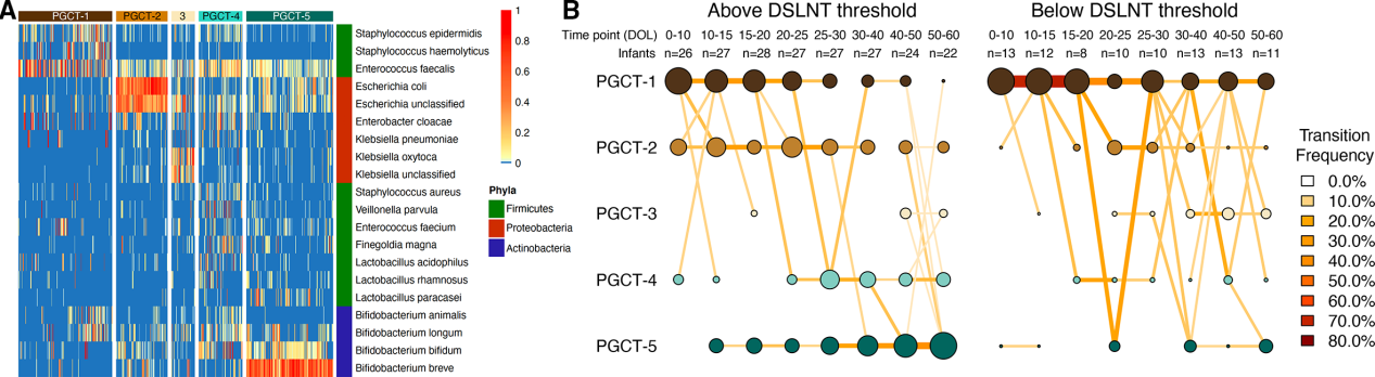 采用種水平數(shù)據(jù)對(duì)PGCTs進(jìn)行DMM聚類,5種PCGTs最理想(圖4A)。PGCT-1特征菌是高豐度Staphylococcus?spp和Enterococcus faecalis,PGCT-2高豐度Escherichia?spp,PGCT-3高豐度Klebsiella?spp,PGCT-4和PGCT-5高豐度Bifidobacterium?spp,B. breve在PGCT-5豐度高。根據(jù)樣本在所有時(shí)間點(diǎn)和clusters上的分布,在出生后前70天內(nèi)接受MOM中DSLNT高于和低于241nmol/ml的嬰兒微生物組差異顯著(圖4B)。在校正組間抽樣頻率不均勻后,最后一個(gè)時(shí)間點(diǎn)接受MOM超過DSLNT閾值2倍的嬰兒類似于PGCT-5,其Bifidobacterium高豐度(圖4A)。