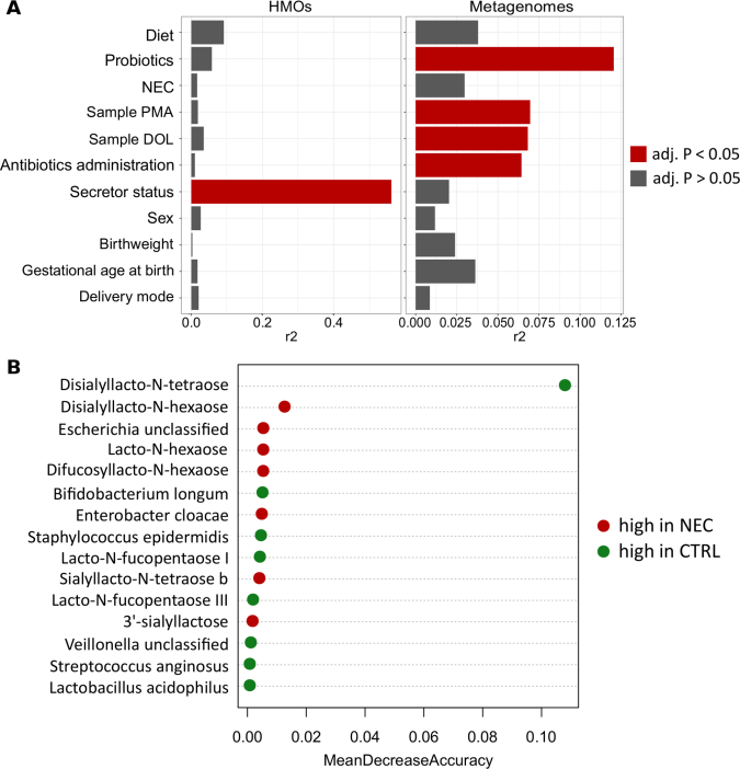 結(jié)果:相比對(duì)照組,NEC患兒母親母乳中HMO和DSLNT濃度顯著降低。MOM閾值為241nmol/ml對(duì)NEC的敏感性和特異性為0.9。NEC發(fā)病前的宏基因組測序顯示,NEC患兒Bifidobacterium longum相對(duì)豐度降低,Enterobacter cloacae相對(duì)豐度升高。低MOM DSLNT影響微生物組的縱向發(fā)展,這與過渡到以雙歧桿菌為主的早產(chǎn)兒腸道菌群類型的減少有關(guān),通常在年齡大一些的嬰兒中觀察到。疾病前HMO和宏基因組數(shù)據(jù)結(jié)合隨機(jī)森林分析區(qū)分嬰兒健康或是NEC準(zhǔn)確度為87.5%。