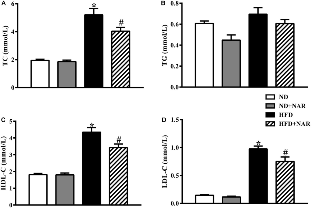 圖2為四組小鼠血脂結果。與對照相比,HFD組小鼠TC、HDL-C和LDL-C水平升高,提示HFD組血脂代謝異常。補充NAR可以預防HFD引起的高血脂,四組間血清TG水平差異不顯著。