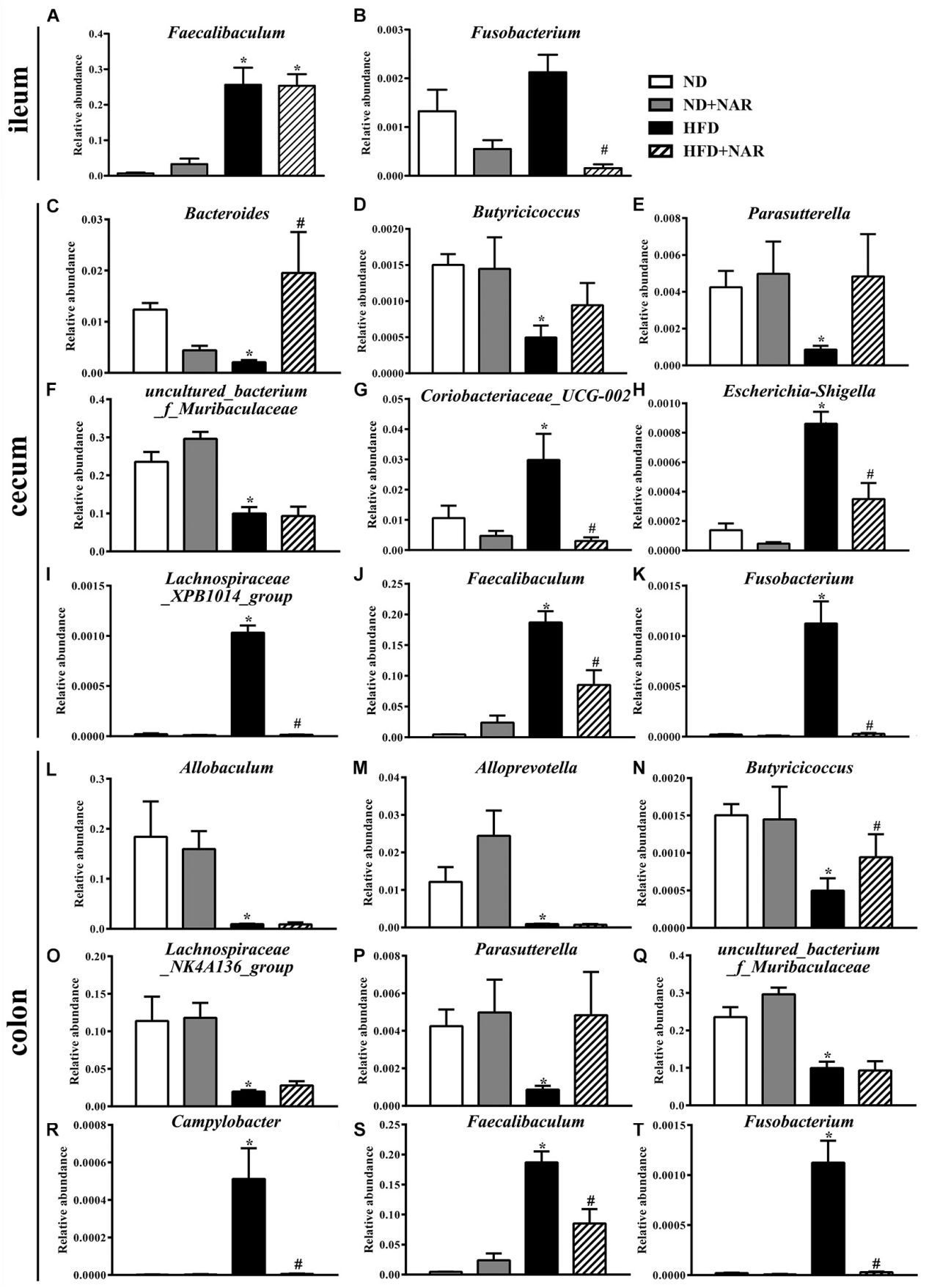 優(yōu)勢菌屬和差異菌屬熱圖顯示,補充NAR改變了HFD誘導的腸道細菌變化(圖6D-F)。與ND組相比,HFD組盲腸中Coriobacteriaceae_UCG-002、Escherichia-Shigella、Faecalibaculum、Fusobacterium、Lachnospiraceae_XPB1014_group、Parvibacter、Ruminococcaceae_UCG-005和Turicibacter相對豐度較高,Campylobacter、Dubosiella、Faecalibaculum和Fusobacterium在結腸中相對豐度較高,Bacteroides在盲腸中相對豐度較低,Butyricicoccus在結腸中相對豐度較低。NAR處理逆轉了這些效果。與ND組相比HFD飼喂小鼠腸道菌群顯示Butyricicoccus、Parasutterella和uncultured_bacterium_f_Muribaculaceae在盲腸中相對豐度較低,Allobaculum、Alloprevotella、Lachnospiraceae_NK4A136_group、Parasutterella和uncultured_bacterium_f_Muribaculaceae在結腸中相對豐度較低,F(xiàn)aecalibaculum在回腸中相對豐度較高。HFD+NAR組Bradyrhizobium、[Eubacterium]_nodatum_group、GCA-900066575、Jatrophihabitans、Massilia、Peptococcus、Sphingomonas、uncultured_bacterium_o_Acidobacteriales、uncultured_bacterium_f_Micropepsaceae和uncultured_bacterium_f_Xanthobacteraceae在盲腸中相對豐度較高,Bacteroides、Bradyrhizobium、Candidatus_Solibacter和 uncultured_bacterium_f_Xanthobacteraceae在結腸中相對豐度較高,F(xiàn)usobacterium在回腸中相對豐度較低。圖7為相對豐度改變的細菌統(tǒng)計結果,這些結果表明NAR調節(jié)了HFD小鼠腸道細菌。