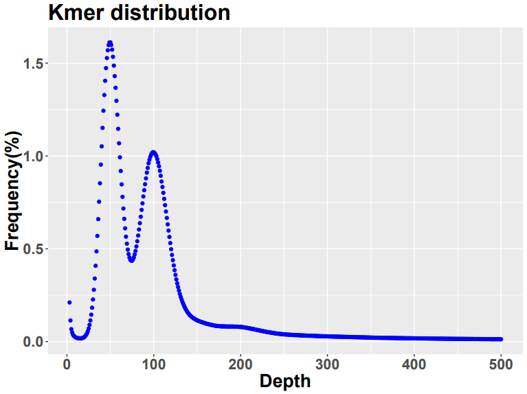 在理想狀態(tài)下,K-mer曲線服從泊松分布,即只會出現一個明顯的主峰。但對于一個雜合二倍體,主峰前1/2出會出現一個雜合峰,在雜合度較高的時候可能出現高過主峰的情況。下圖即為一個高雜合二倍體kmer的頻率-深度分布圖。主峰后二倍位置內的峰為重復峰。但如果雜合度很低,可能分布圖中只有一個峰存在。主峰所代表的就是k-mer平均覆蓋深度,用主峰深度代替公式中的k-mer平均覆蓋深度即可算得該基因組的大小。