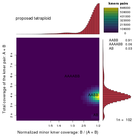Smudgeplot通過尋找雜合k-mer來研究基因組的倍性,其定義的雜合k-mer對指的是一對k-mer之間只相差一個堿基,且沒有第三個k-mer與他們再相差一個堿基(如ATGATCA, ATGCTCA, ATGGTCA)。對于一個AB形式的雜合,smudgeplot試圖從所有k-mer中尋找一對雜合k-mer,而對于一個AAB形式的雜合,smudgeplot試圖尋找兩條相同的k-mer和一條它們的雜合k-mer,在圖中表示為更高的亮度。如下圖對一個四倍體的smudgeplot分析,可以明顯的看出AABB雜合模式附近的k-mer數量明顯高于其它k-mer,左上角也描述了這個結果。