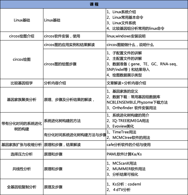 隨著測(cè)序技術(shù)的發(fā)展及測(cè)序成本的降低,越來越多的物種完成了基因組的組裝,這為多物種比較基因組學(xué)分析提供了大量的可用基因組資源。為了協(xié)助科研工作者對(duì)基因組結(jié)果進(jìn)行深度挖掘,本課程將從基礎(chǔ)生信操作開始,從已發(fā)表的NG、NC等高水平文章入手,帶領(lǐng)大家學(xué)習(xí)比較基因組學(xué)常用的分析方法,從而滿足文章后期發(fā)表的需求,同時(shí)也為我們生物信息科學(xué)工作者們提供一個(gè)互相交流的平臺(tái)。