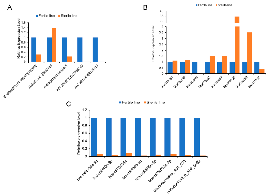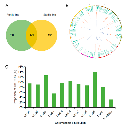 在以往的研究中,CircRNA作為內(nèi)源非編碼RNA的一員,被認(rèn)為具有miRNA海綿和競(jìng)爭(zhēng)性內(nèi)源RNA(ceRNA)功能。關(guān)于CircRNA在雄性不育和花藥發(fā)育中研究較少,因此作者在油菜中構(gòu)建了細(xì)胞質(zhì)雄性不育系(CMS),對(duì)不育系和可育系花蕾進(jìn)行全轉(zhuǎn)錄組測(cè)序,揭示了油菜花藥發(fā)育中新的circRNA–miRNA–mRNA調(diào)控網(wǎng)絡(luò),為進(jìn)一步研究CircRNA和miRNA在花藥發(fā)育中的功能提供了一定的基礎(chǔ)。