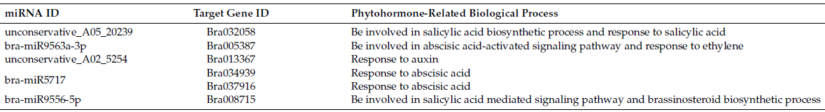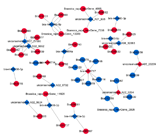 作者使用了TargetFinder來(lái)預(yù)測(cè)miRNA的靶基因,結(jié)合差異分析的結(jié)果最終得到170對(duì)miRNA和基因的調(diào)控關(guān)系,包含了18個(gè)miRNA和37個(gè)基因。對(duì)這些基因進(jìn)行GO富集分析,發(fā)現(xiàn)主要是細(xì)胞過(guò)程、代謝過(guò)程等功能。對(duì)構(gòu)建的網(wǎng)絡(luò)進(jìn)行研究發(fā)現(xiàn)miRNA所調(diào)控的基因主要是涉及糖代謝、脂質(zhì)代謝、花粉管生長(zhǎng)等,同時(shí)也發(fā)現(xiàn)這些miRNA與植物激素相關(guān),比如bra-miR9556-5p可能通過(guò)靶向Bra008715來(lái)參與水楊酸介導(dǎo)的信號(hào)通路和油菜素類固醇生物合成過(guò)程途徑。