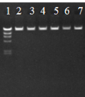 圖1:將提取的DNA每孔上樣300 ng,瓊脂糖濃度為1%,70 V電壓,跑膠45 min。膠孔1:Marker;2:月季花;3:南瓜莖;4:水稻葉子;5:番茄果;6:玉米根;7:水稻種子。