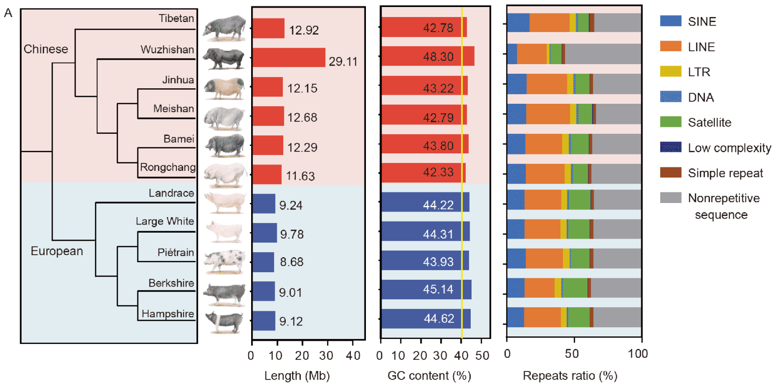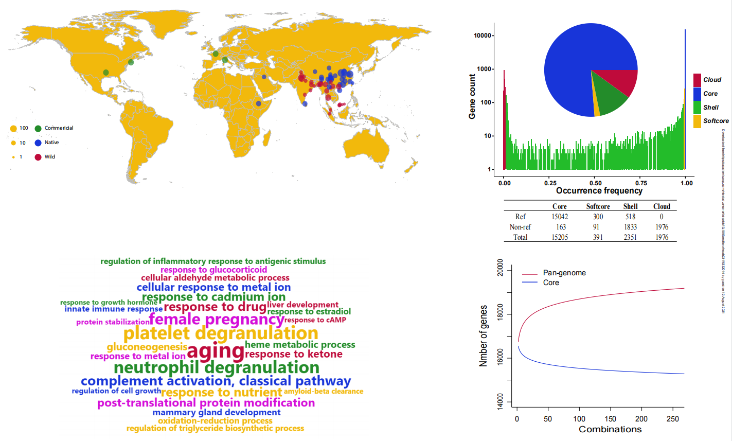 • 對(duì)于一些農(nóng)業(yè)畜牧養(yǎng)殖相關(guān)的動(dòng)物,往往由于人工的干預(yù)或是自然環(huán)境的選擇,在同一個(gè)種內(nèi)水平下會(huì)有非常多的品系/亞種/變種。這些馴化前后的群體間表型和基因型的巨大差異可能隱藏在每個(gè)品系基因組種,因此能體現(xiàn)這些動(dòng)物品系內(nèi)的共性又能體現(xiàn)不同品種間差異的泛基因組就顯得尤為重要。