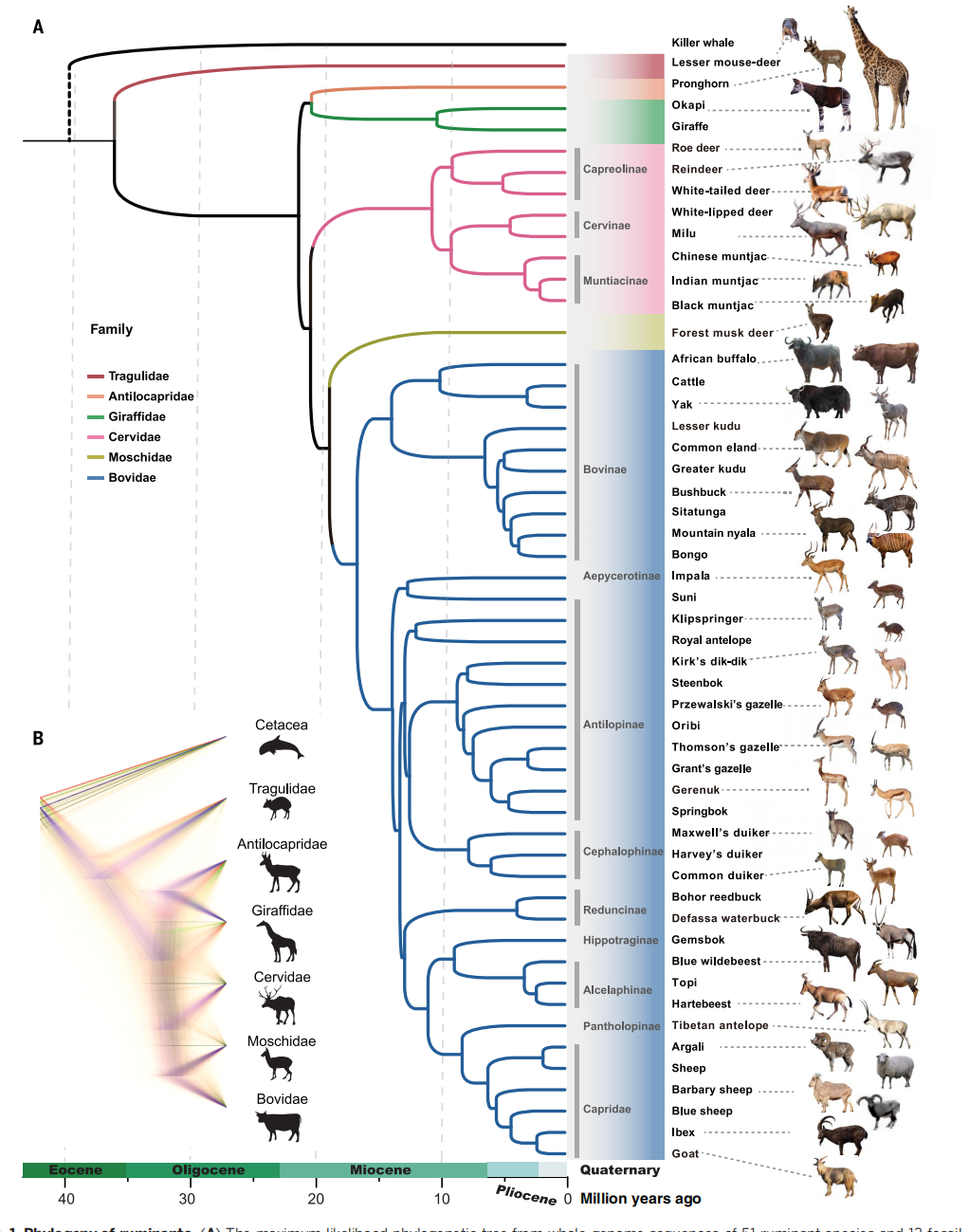 同樣這樣大規(guī)模不同科屬研究的還有2020年Nature封面文章,通過(guò)6種蝙蝠基因組揭示演化和潛在功能,探索蝙蝠有別于其他哺乳動(dòng)物的免疫調(diào)節(jié)機(jī)制。以及2020年發(fā)表在Science上的反芻動(dòng)物基因組,該研究共進(jìn)行了6個(gè)科的44個(gè)反芻動(dòng)物De novo組裝,結(jié)合化石信息,構(gòu)建了所有節(jié)點(diǎn)100%支持的全基因組系統(tǒng)發(fā)育樹(shù),高置信度的進(jìn)化樹(shù)進(jìn)一步確認(rèn)了叉角羚科與長(zhǎng)頸鹿科的姐妹類(lèi)群關(guān)系,以及麝科與??平忝妙?lèi)群關(guān)系等一直以來(lái)備受爭(zhēng)議的分類(lèi)問(wèn)題。并對(duì)反芻動(dòng)物基因組結(jié)構(gòu)特征及演化進(jìn)行研究,進(jìn)而對(duì)反芻動(dòng)物中的“消化系統(tǒng)”“多腔胃演化”“角形態(tài)”“體型”等特征進(jìn)行解析。該研究基于大量的基因組數(shù)據(jù),將反芻動(dòng)物基因功能與動(dòng)物的適應(yīng)性性狀聯(lián)系起來(lái),為動(dòng)物譜系基因組打開(kāi)了一個(gè)新的研究篇章。