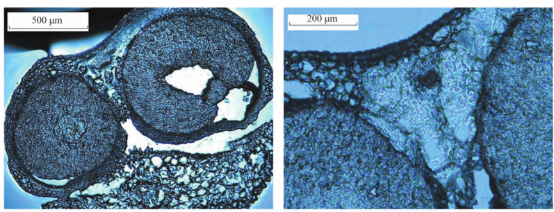 動(dòng)物組織常用HE(蘇木精-伊紅染色法 ( hematoxylin-eosin staining ))染色,可以精準(zhǔn)識別組織形態(tài)和病理學(xué)鑒定。然而植物的組織存在的纖維素和一些木質(zhì)素不適合HE染色方法,采取的是甲苯胺藍(lán)染色法,其基本原理是植物組織木質(zhì)化細(xì)胞壁呈藍(lán)綠色,其他組織成分呈紫藍(lán)色,可以精準(zhǔn)輔助判斷植物組織形態(tài)學(xué)和確定捕獲區(qū)域。