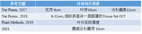 動(dòng)物組織樣本細(xì)胞類型,結(jié)構(gòu)相對比較簡單,切片厚度比較統(tǒng)一,基本上保持在10μm厚度左右。但是植物樣本組織結(jié)構(gòu)復(fù)雜,而且木質(zhì)化程度不一,組織相對RNA含量較低,因此植物切片厚度一般根據(jù)樣本類型不同,選擇不同的切片厚度,一般植物冷凍切片厚度范圍為10-50um,根據(jù)物質(zhì)組織類型切片厚度會(huì)有所不同,視具體情況而定。