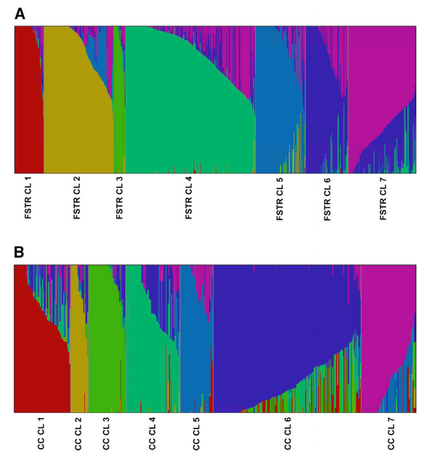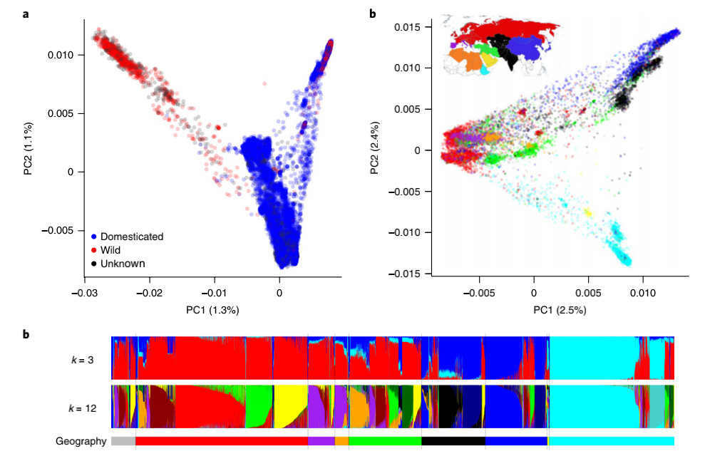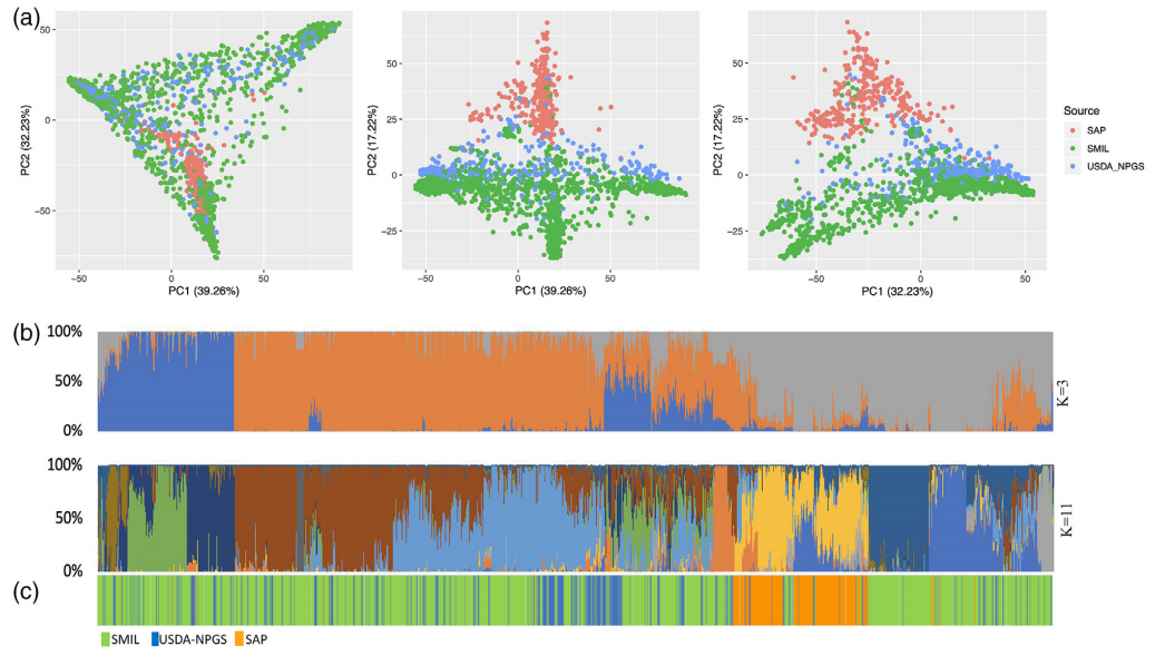 基因庫收集和保存大量植物和詳細的護照信息,目的是保護遺傳多樣性以進行保護和育種。此類集合的遺傳表征有可能闡明重要作物的遺傳歷史,使用標記-性狀關(guān)聯(lián)來鑒定感興趣性狀的位點,尋找正在進行選擇的位點,并通過識別分類錯配和重復(fù)為基因庫管理作出貢獻。本研究通過GBS測序?qū)碜匀蚧驇斓?0,038個辣椒 (Capsicum spp.) 種質(zhì)進行基因分型,并調(diào)查了這種標志性主食的近期歷史?;赟NP數(shù)據(jù)計算了identity-by-state (IBS) 比例,在基因庫內(nèi)和基因庫之間檢測到多達 1,618 個重復(fù)種質(zhì)。進一步深入分析了常見食用辣椒的遺傳多樣性以調(diào)查其歷史,發(fā)現(xiàn)在全球廣泛地區(qū)收集的辣椒種類有很大的重疊。GWAS分析和選擇清除分析發(fā)現(xiàn)辣椒性狀,如刺激性,這些性狀在全球分布不均勻,表明人類偏好對馴化辣椒的遺傳結(jié)構(gòu)產(chǎn)生了主要影響。